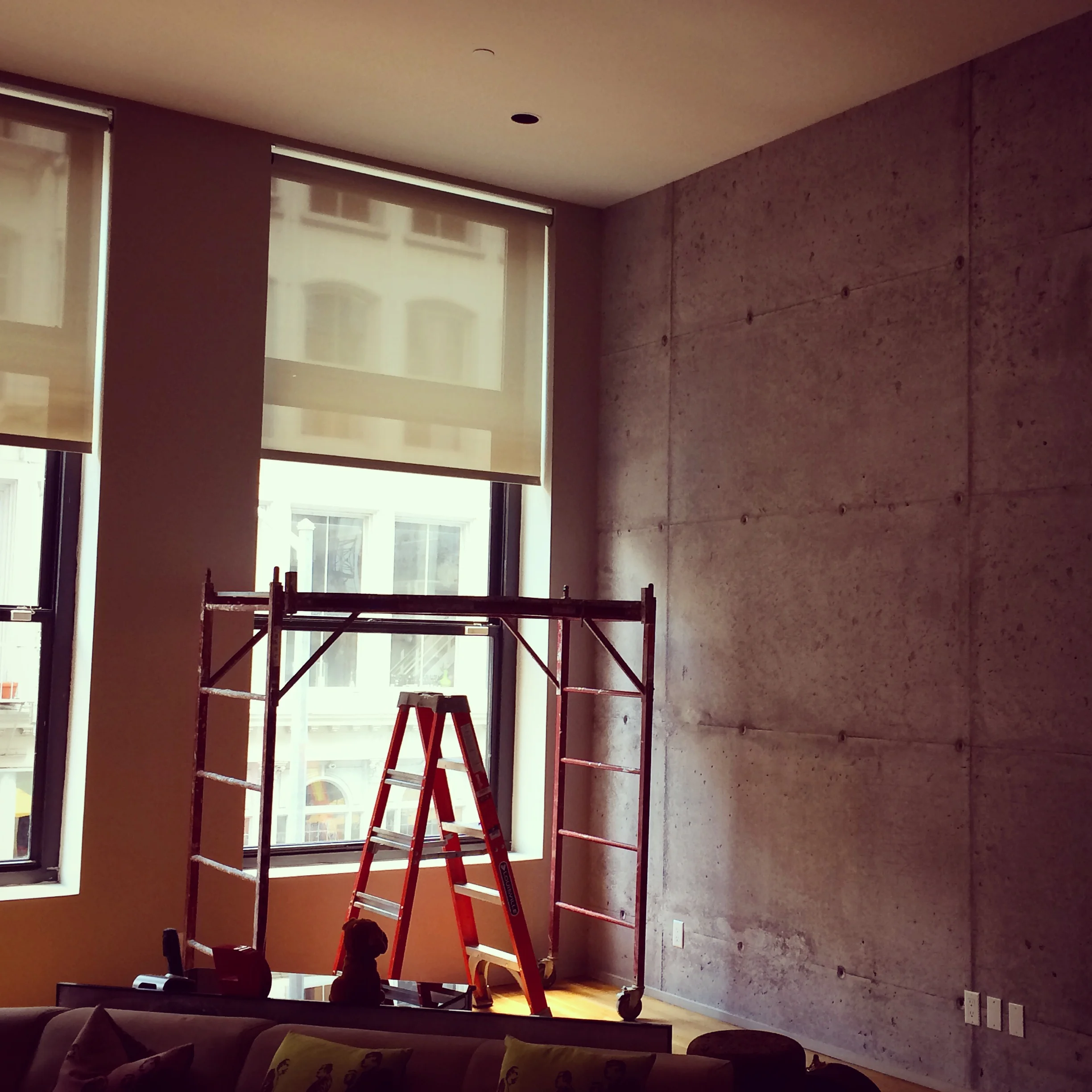 So, as expected, today is the day we install wallpaper and electric solar shades and I am exhausted. I received the wallpaper in one standard wallpaper box and I about lost it - I mean we're talking 13' high ceilings and all that custom wallpaper from England fits in one box!!!???